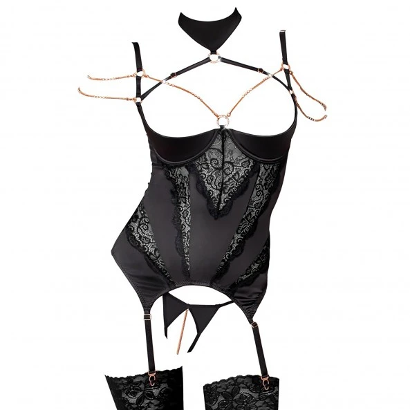La guêpière à jarretelle est fabriqué en satin élastique avec parties en dentelle fine et tour de cou avec fermeture à velcro. L’armature intégrée avec des bonnets légèrement rembourrés met la poitrine en valeur. Bretelles réglables. Les chaînettes décoratives couleur or rose sont serties de strass et sont amovibles par mousqueton.