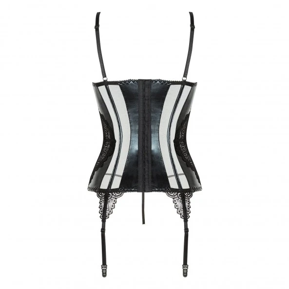 Cet ensemble de lingerie fine aura à coup sûr un effet renversant grâce à sa coupe qui épouse toutes les formes de votre corps au plus près grâce à un tissu très élastique. La courbure de vos seins est mise en avant par une délicate dentelle ajourée qui laisse l’imagination galoper avec élégance. L’armature du soutien-gorge permet de tenir haut la poitrine pour un décolleté encore plus plongeant tandis que la partie basse de la guêpière va affiner votre taille et creuser votre dos pour offrir une vue magnifiée du bas de vos reins. La guêpière se termine par le porte-jarretelles auquel vous viendrez accrocher les bas de votre choix. Le noir intense ajoute une touche d’élégance et de mystère à cette si séduisante tenue.