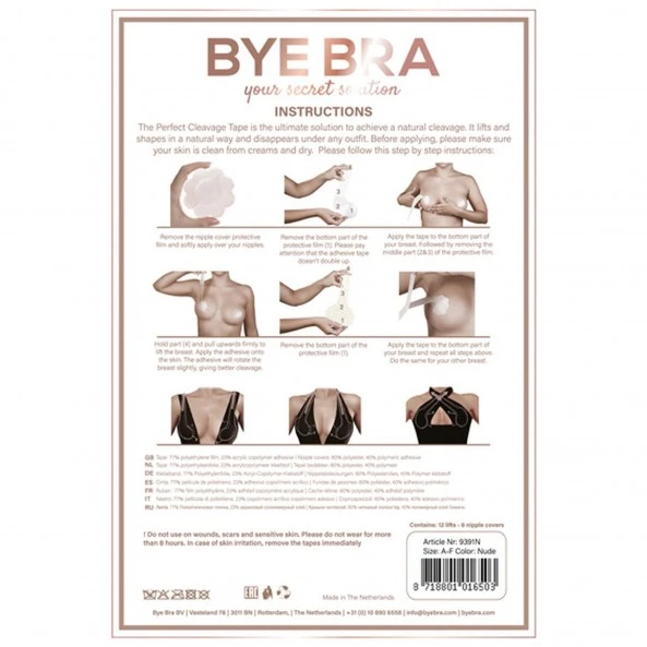 Chaque bande comporte un cache-mamelon de protection en soie. Ils auront pour but de rendre le port agréable et d’estomper les mamelons pour les vêtements au plus près du corps. Le rehaussement ne pourra pas aller au-delà de 12 cm. Même en cas de forte humidité la tenue sera optimale pendant environ 8 heures. Vous trouverez également dans la pochette, un mode d’emploi en 8 langues dont le Français. Mais rien ne vaut une vidéo que vous trouverez un peu plus bas sur cette page.