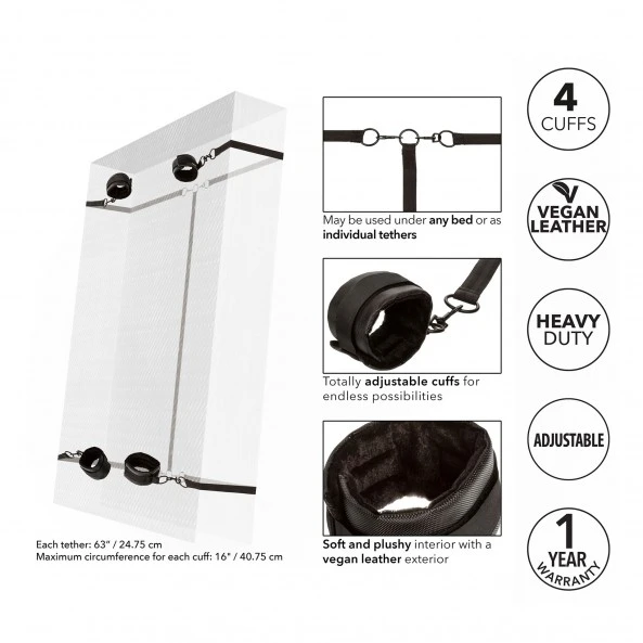 Le Kit D’attaches sous Lit Boundless Bed Restraint est bien conçu et simple d’utilisation. Les 4 points de contrainte sont assemblés simplement sur le lien central qui sera placé sous le matelas. La sangle de chacune des 4 entraves mesure 1,60 mètre et pourra donc être ajustée individuellement et s’adapter à n’importe quels formats de matelas. Par souci de confort, les bracelets de contrainte sont doublés en velours afin d’éviter les irritations. Elles s’ajustent et se verrouillent par une large bande de velcros renforcés. Simple et efficace !