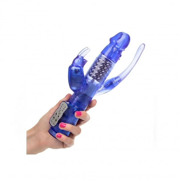 Rabbit Delight Triple Orgasme est un stimulateur à 2 fonctions indépendantes qui ne pourra pas vous laisser de marbre. La plus longue des deux parties abrite 5 rangés de billes rotatives pour un profond massage du conduit vaginal. La deuxième, l’appendice clitoridien vibrant dont les 2 petites oreilles balaieront votre petit bouton. La troisième, est un long appendice doux et souple qui caressera la zone anale. La totale en somme !!! La firme Américaine Calexotics et sa fondatrice Susan Colvin sont renommées depuis de longues années en matière de sex-toys ultras efficaces ! Dirigée et exploitée uniquement par des femmes, efficacité et savoir faire, voilà les maîtres mots de la marque.