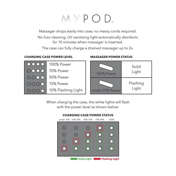 Dans le détail, le Stimulateur My Pod est entièrement recouvert d’ABS lisse, hypoallergénique, sans odeur et sans phtalate. Equipé d’un puissant moteur avec 7 programmes différents pour la stimulation. Son pilotage s’effectue par un seul bouton. Une pression de 3 secondes pour la mise en route, puis une autre pour le mode 1 et encore une autre pour le mode 2 etc… Une autre pression de 3 secondes sera nécessaire pour stopper et verrouiller l’appareil. L’étui se recharge à l’arrière à l’aide d’un câble USB fourni qui pourra être branché sur un ordinateur mais idéalement sur un chargeur de téléphone mobile de type, IPhone®, Samsung® ou autres … La charge complète de l’appareil sera obtenue en 2H00 environ pour 1H30 à pleine puissance. 50 minutes seront disponibles avec une utilisation à pleine puissance. IMPORTANT !!! Le Stimulateur My Pod est entièrement Waterproof mais pas du tout son chargeur !