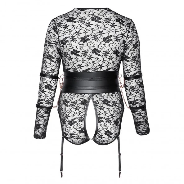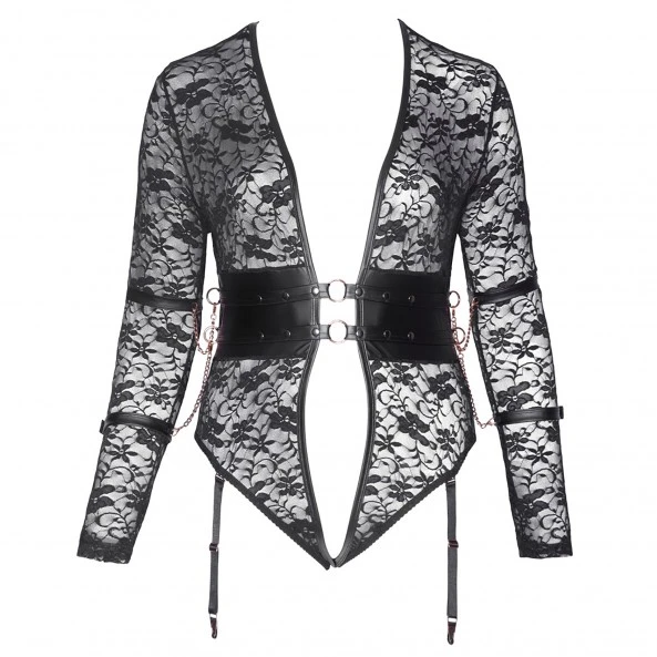 Les bretelles réglables sont détachables de la partie culotte. Le body est complétement ouvert des seins aux fesses et les deux parties sont simplement reliées par deux anneaux en métal.