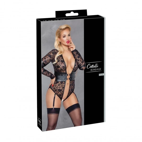 Le Body Ouvert Grande Taille Dentelle et Menottes Cottelli Bondage est réalisé en dentelle souple au motif floral et des inserts plus mat à l’effet mouillé. Les 4 menottes sont reliées au body par des chainettes en métal doré et par des mousquetons.