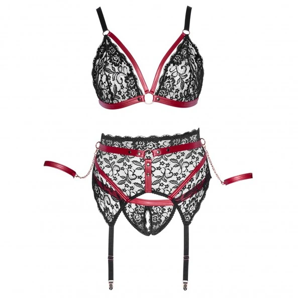 Ensemble de lingerie grande taille Cottelli Bondage comprenant un soutien-gorge souple, un porte-jarretelles, des menottes et une culotte ouverte. Un design sophistiqué en rouge et noire avec éléments en métal doré rose.
