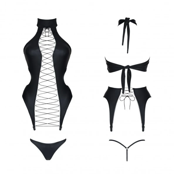 Soyez sexy, soyez irrésistible avec cet ensemble de lingerie de Demoniq. La guêpière Hekate fait tout pour rendre votre corps encore plus excitant. Le tissu se contente de suivre votre silhouette sur vos deux côtés tandis que le ventre et la poitrine sont laissés à découvert par le laçage. Il en résulte un décolleté flamboyant, et une guêpière qui vient se refermer autour de votre cou pour un effet BDSM très réussi. Elle se termine en bas par la jarretelle qui vient accrocher les bas, et un string minimaliste dans le même tissu noir brillant que la guêpière elle-même. Devant comme derrière, vous pourrez modifier le laçage tant pour votre confort que pour appuyer votre silhouette.
