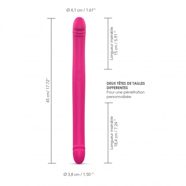 Un des produits les plus efficaces de la marque Dorcel, le tout nouveau Orgasmic Double Do. Équipé maintenant de 2 moteurs indépendants actionnant de manière différente chacune des extrémités. Pour le diamètre le plus « faible » (3,8 cm), une oscillation permettra une stimulation exceptionnelle du Point-G. Pour ce dernier, vous aurez le choix entre 9 modes différents d’oscillation. Du côté opposé, c’est un mouvement de « va-et-vient » qui anime cette extrémité d’un diamètre conséquent de 4,1 cm. Cette dernière vous procurera LA pénétration dont vous rêvez grâce à ses 9 intensités allant de très douce à très fortes. À utiliser seul ou en couple, il est d’une douceur et souplesse extrême. Ses fonctions et ses 45 cm contenteront sans aucun doute les plus exigeantes d’entre vous !