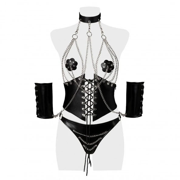 - un corset réglable relié à un collier par des chaînes en métal qui soulignent les courbes de la poitrine.
