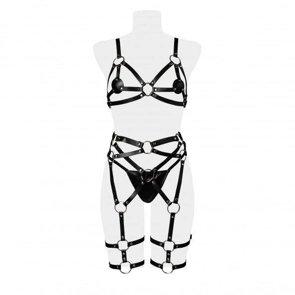 L’Ensemble Harnais Simili-Cuir 3 Pièces audacieux au look bad girl avec le simili cuir et le métal se compose de 3 pièces :