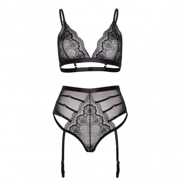 Leg Avenue propose ici un ensemble 2 pièces assez original, comme sait le faire la marque. Cet ensemble se compose de la culotte et du soutien-gorge. Cette dernière pièce propose des bonnets faits de dentelle au style graphique très travaillé. C’est la culotte qui sort particulièrement de l’ordinaire. Elle remonte haut sur le ventre, au-dessus du nombril. Des lanières rehaussées de petits coeurs dorés font le tour de vos hanches sur toute la hauteur de la culotte pour affiner vos courbes. La dentelle du soutien-gorge est reprise sur le cache-sexe de la culotte pour un bel effet.