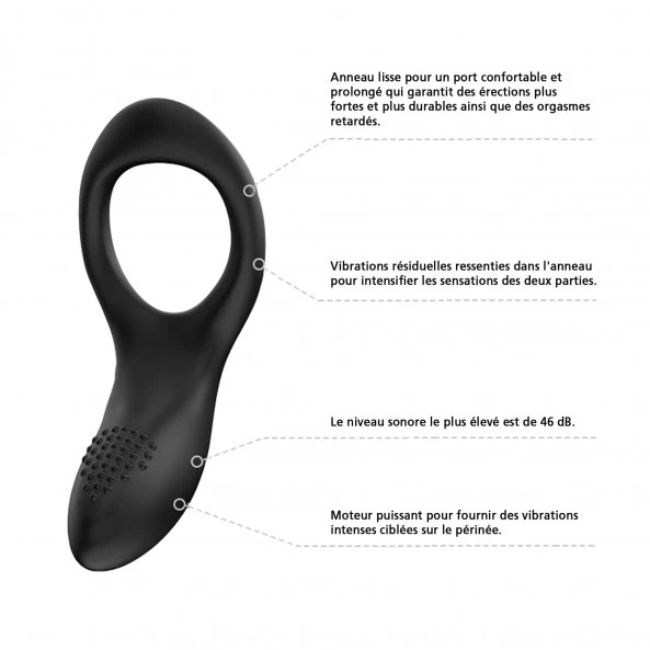 Premier anneau vibrant de la marque qui ne fait pas dans la demi-mesure. Il regroupe tous les avantages possibles pour ce type de sex-toys : 1 puissant moteur, silencieux (46dB Maximum) – 1 chargement facile par câble USB et plot magnétique – 1 hyper connectivité courte et longue distance – Une utilisation en solo ou à deux et des matériaux de très haute qualité. Une fois en place autour de votre verge et de vos testicules, il pourra simultanément les stimuler sans oublier votre périnée. Les vibrations pourront même être transmises au clitoris de votre partenaire si vous choisissez le positionnement approprié.