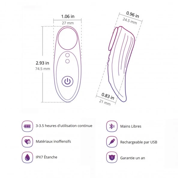 Ce stimulateur féminin, premier du genre pour la marque est une merveille de technologie intelligente. Il se place à la perfection entre votre culotte et votre entre-jambe. Il stimulera en priorité votre clitoris, mais aussi l’ensemble de votre appareil génital. Afin de verrouiller sa position, une pastille magnétique très puissante se place à l’extérieur de la culotte pour maintenir l’ensemble du stimulateur en place. Sa taille est relativement réduite : Longueur : 7,4 cm – Largeur : 2,7 cm – Epaisseur : 2,4 cm. Equipé d’une microcarte électronique Bluetooth 4.0 et d’un puissant moteur, ce dernier pourra vibrer avec un nombre infini de combinaisons via l’application Lovense Remote (voir « Pour plus de détails). Ce sextoy vous procurera d’incroyables sensations aussi bien pour les débutants que les utilisateurs avertis. Une peau silicone de qualité médicale, sans phtalates et hypoallergénique habille ce petit bijou. Parfaitement waterproof (IPX7), il pourra vous accompagner sans aucun problème dans votre douche ou votre bain pour des moments de détente et de plaisirs hors du commun.