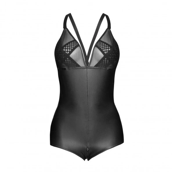 Le body Noir Handmade Promiscous F107 est réalisé dans un tissu élastique effet mouillé qui épouse les courbes de votre corps. Sa coupe combi-short dispose de tulle transparent et dentelles sur les fesses et les seins.