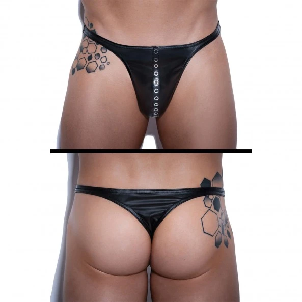 Le string Noir Handmade H048 est réalisé en tissu noir mat doux et souple effet mouillé. Il est décoré d’un bande en tissu imitation cuir avec œillets métalliques.