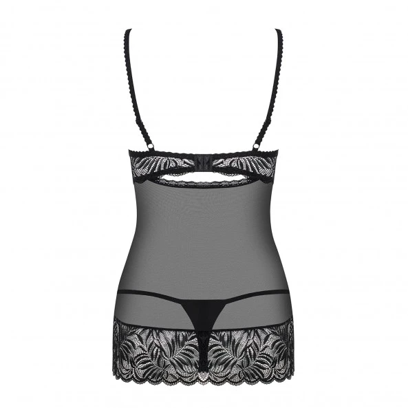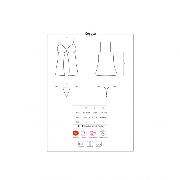 La babydoll Contica est une babydoll qui ne devrait pas cacher grand chose de vous, et cela pour votre plus grand bonheur. La babydoll, c’est d’abord cette maille fine transparente qui s’ouvre sur toute la hauteur sous la ligne de buste. C’est à vous de décider comment la lacer afin de montrer, ou non, votre ventre. Le petit lacet de satin sera un délice à se faire enlever. Au niveau des seins, on retrouve la dentelle au niveau des bonnets qui fait la caractéristique de ce modèle Contica de chez Obsessive. Cette même dentelle ajourée est reprise sur le bas de la babydoll pour mieux laisser un bel aperçu de vos hanches. Tout est sexy dans ce modèle, à vous d’inventer la nuit qui va avec.