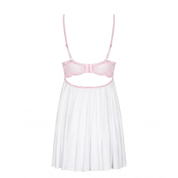 Cette nuisette Babydoll Girlly Rose et Blanc d’Obsessive est sensuelle et mettra vos courbes en valeur avec son décolleté en balconnet et ses bonnets rembourrés semi-transparents. Elle est ornée d’une dentelle florale sur la poitrine et a un dos ajouré en demi-cercle. Le bas de la lingerie est doux et évasé. Les bretelles sont réglables et elle est accompagnée d’un string assorti. Elle fera succomber votre partenaire à son charme.