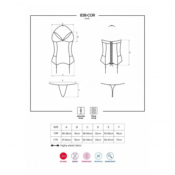 Envie de mettre votre plastique à l’honneur ? Envie de vous sentir féminine, séduisante, irrésistible ? Alors nul doute que ce corset est fait pour vous. N’imaginez pas le corset à l’ancienne, où l’inconfort se disputait à un trop-plein de tissu. La marque Obsessive, connue pour son bon goût en matière de glamour et de séduction, propose ici un modèle exceptionnel. La partie soutien-gorge, avec des bonnets agrémentés de lanières, permet de mettre en avant le volume des seins. Le corset, dans un tissu très élastique, s’adapte à toutes les morphologies tout en élançant votre silhouette grâce aux bandes verticales discrètes mais présentes. Le confort, la sexy attitude, l’effet glamour, tout se combine pour rendre fou de désir votre partenaire et faire honneur à votre corps.