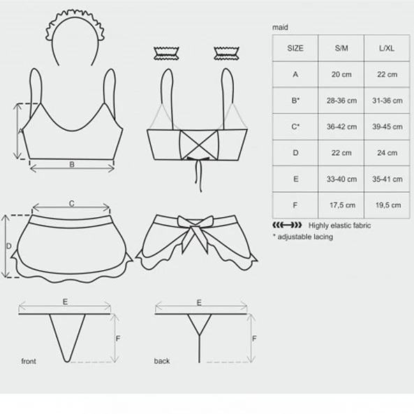 Ce Costume sexy de Soubrette Maid par la marque Obsessive est composé d’un tablier à l’allure de mini-robe sexy sur le devant et échancré sur l’arrière pour les regards envieux ! Bordé d’une magnifique dentelle, le tablier s’accorde parfaitement avec la brassière assortie qui s’ajuste parfaitement à votre poitrine grâce à son laçage de ruban satiné.