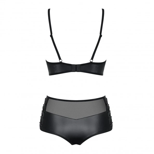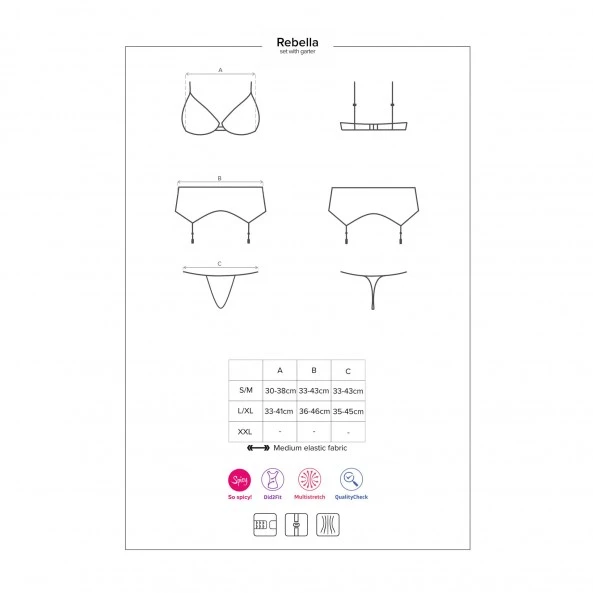 Cet ensemble 3 pièces en tulle serré noir opaque, laçages sexy’s et petites frises de dentelle regroupent de manière habile provocation et élégance à la fois. Aussi bien sur le soutien-gorge que sur le porte-jarretelles rien n’est franchement visible. Pourtant les simples petites ouvertures en lacets à l’arrière du string, au centre du soutien-gorge ainsi que de part et d’autre des hanches font toute la différence pour rendre cet ensemble sublimement sexy. Voilà où réside entre autres le savoir-faire d’Obsessive. L’alliance du laçage et des petits anneaux métalliques se chargera de l’aspect BDSM. Ajoutez enfin les bas Darkie comme présentés sur ce modèle, et là…, Cela sera que du bonheur pour votre partenaire ! Les bas Darkie sont vendus séparément.