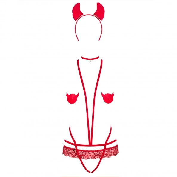 Envie d’exprimer votre incandescence, vos désirs qui ne demandent qu’à être assouvis ? Vous n’aurez pas de meilleurs moyens de les exprimer que cet ensemble Evilia. Le body à lui seul est une promesse de moments coquins puisqu’il ne se compose que de quelques lanières d’un rouge vif qui viennent dessiner vos hanches, votre bassin, votre poitrine. Bien sûr, avec une tenue si érotique, il ne peut s’agit que d’un body ouvert sur votre entrejambe, pour encore plus de sensualité. Et si les jeux de rôle vous tentent, vous pouvez pousser plus loin avec la série d’accessoires fournis avec l’ensemble : cache-tétons, tour de cou et serre-tête en forme de cornes. Promis, la nuit va être grandiose.