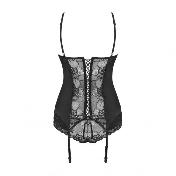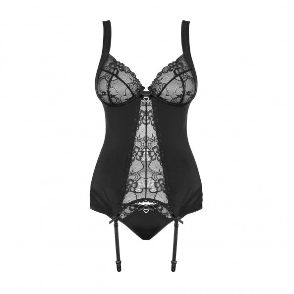 Équipé de jarretelles réglables, vous pourrez marier cette guêpière et son string assorti inclus aux bas rouge Obsessive S800 ou bas noir Obsessive S800.