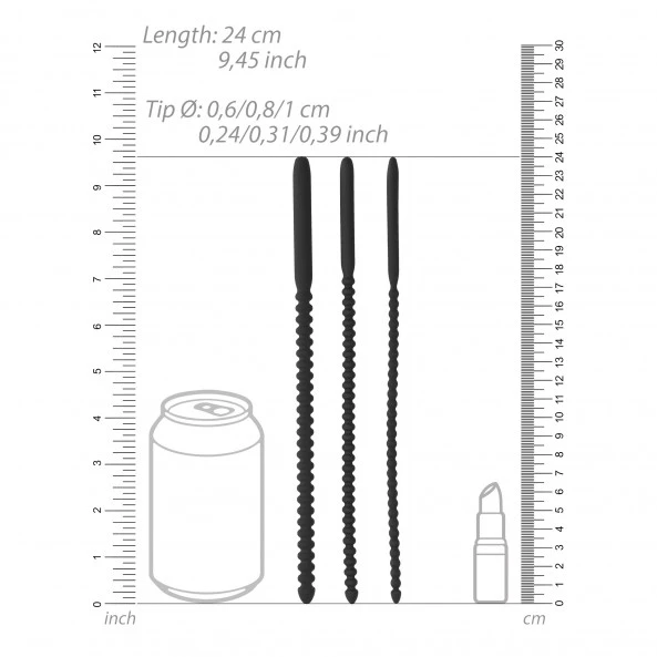 Ce Kit de 3 Tiges Urétrales Perlées en Silicone sont 100% silicone ultra souple est dédiée à toutes les personnes averties ou débutantes dans les pratiques BDSM. Leurs formes allongées (240 mm) sont recouvertes d’une trentaine de petites perles sur une longueur de 175 mm qui feront frémir votre partenaire à chaque insertion et à chaque retrait. L’urètre est une zone très innervée et incroyablement érogène capable de procurer des sensations de plaisir puissantes et hors du commun. Elles ne sont pas creuses et empêchent donc la miction et l’éjaculation. La douceur de la matière permet une insertion facile et sans douleur. Sensations intenses à découvrir ou redécouvrir pour les débutants et les personnes averties. Ce lot comprend 3 tiges d’un diamètre de 6, 8 et 10 mm.