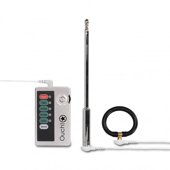 Cette longue Tige Urétrale en acier inoxydable (150 mm) est dédiée aux personnes aguerries aux pratiques extrêmes du BDSM. Elle est en grande partie lisse pour une insertion sans effort. Cette dernière comporte une prise connectable au premier plot d’électro-stimulation. Ce pack comprend également un anneau pénien en silicone souple qui peut être connecté simultanément via le deuxième plot du système d’électrostimulation. Équipés de ce dernier, ces deux éléments deviennent une arme d’intenses plaisirs redoutablement efficace. La télécommande à laquelle ils sont reliés vous donnera accès à 4 modes d’électro-stimulation (Tap, Vibrating, Massage et Auto) dont vous pourrez régler la vitesse par un bouton (Speed) ainsi que l’intensité grâce à la molette (Weak/Strong) sur le côté de cette dernière. Vous pourrez donc découvrir les joies érotiques de l’électro-stimulation qui pourront vous procurer du bien-être, mais aussi exercer un pouvoir de domination si vous confiez la télécommande à votre partenaire de jeux BDSM.