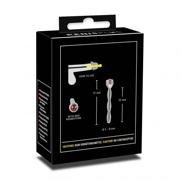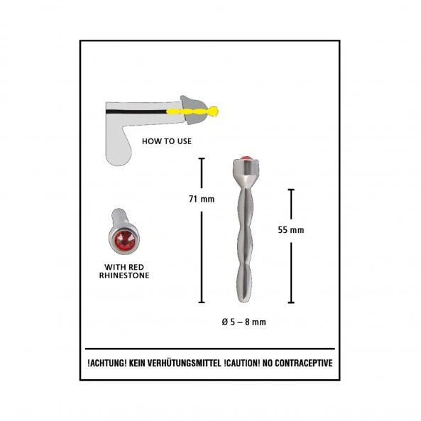 Dimensions : Plug urétrale : Longueur totale : 7,1 cm – Longueur insérable : 5,5 cm – Diamètre insérable : 5-8 mm.