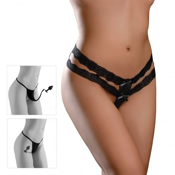 Un String Lanières Fines Bijoux Anal Secret Gem Noir pour être toujours prête ! Petit, mais efficace, ce string minimaliste fait de fines lanières en dentelle et de petits nœuds de satin noir cache un petit secret. En effet, la partie de l’entre-jambe se termine par un petit plug anal amovible, doux et souple (Longueur insérable : 6 cm pour un diamètre insérable : 2,8 cm) qui assurera la tenue de ce string peu banal. Le string ainsi que son plug de petite taille, peuvent être portés pendant plusieurs heures. Sa base anti-avalement est décorée d’un grand bijou cristallin. Il est en silicone de grande qualité hypoallergénique, sans phtalate et sans latex et l’ensemble est 100% waterproof. Complètement dissociables, le string et son plug sont faciles d’entretien et de nettoyage. Disponibles en 2 tailles : unique et grande taille. L’excitation d’abord et la surprise par la suite sont garanties pour votre partenaire.