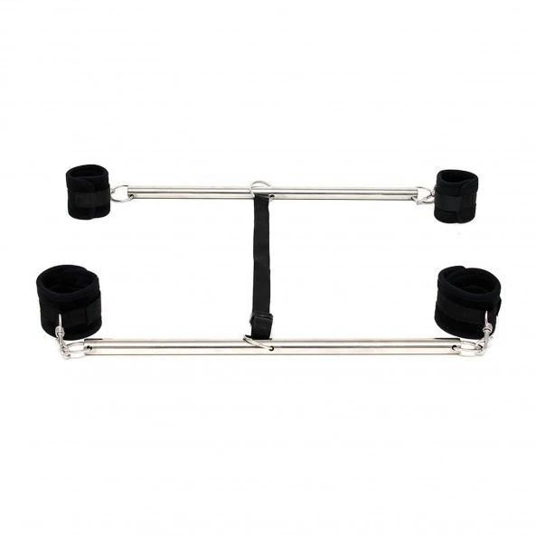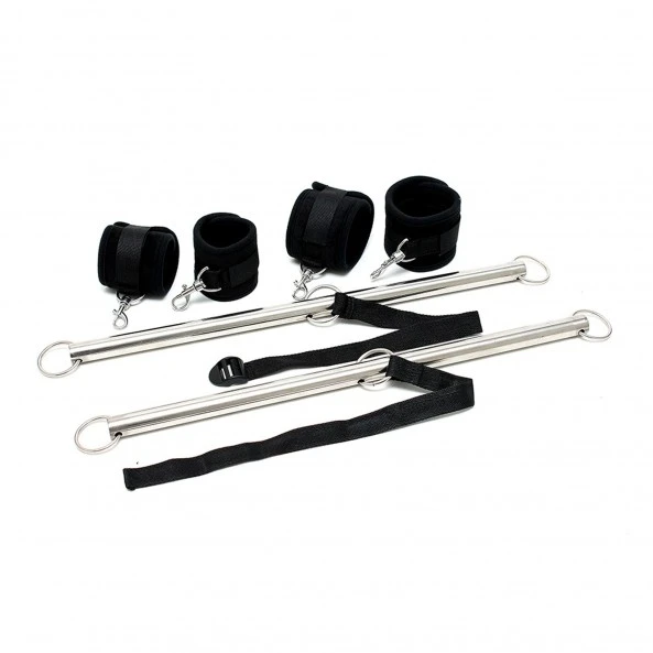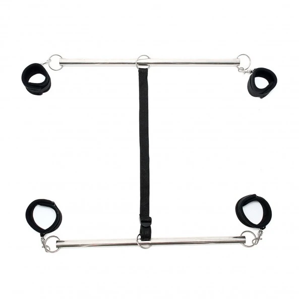 L’ensemble bondage dispose de deux barres d’écartement en métal chromé relié par une sangle réglable.