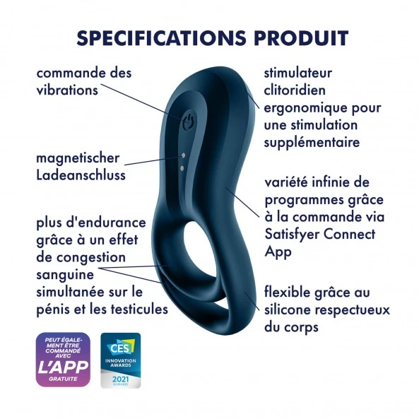 Le Satisfyer Cockring Vibrant Connecté Epic Duo est conçu pour la stimulation clitoridienne pour Madame et de puissantes vibrations pour Monsieur. Cet anneau enserre à la fois le pénis et les testicules (Ball Stretcher). Il est conçu pour délivrer un maximum de plaisirs partagés. Il est animé par 1 puissant moteur silencieux qui délivre 12 programmes d’usine utilisables à partir de l’appareil lui-même et de son bouton central. Vous pourrez également le piloté à partir d’un Smartphone via une interface Bluetooth et son application gratuite Satisfyer Connect®. Cette application est disponible sur l’App Store® et Google Play® et vous donne accès à toute une série de programmes et modes de fonctionnement tous aussi délirant les uns que les autres… Il est entièrement recouvert de silicone hypoallergénique de très haute qualité. Ce jouet discret et surpuissant vous fera vibrer à l’unisson, vous et votre partenaire. Enfin, Epic Duo est équipé d’une batterie interne lithium-ion rechargeable par câble USB magnétique fourni avec l’appareil et il pourra sans problème vous suivre dans votre baignoire ou sous votre douche, car il est complètement waterproof (IPX7). À utiliser sans modération !