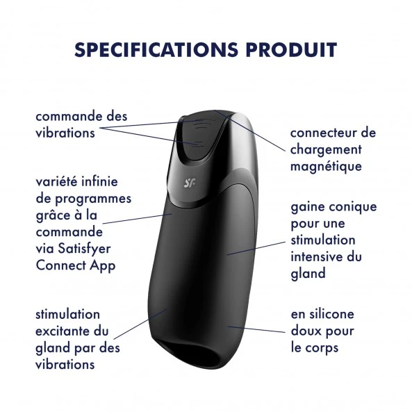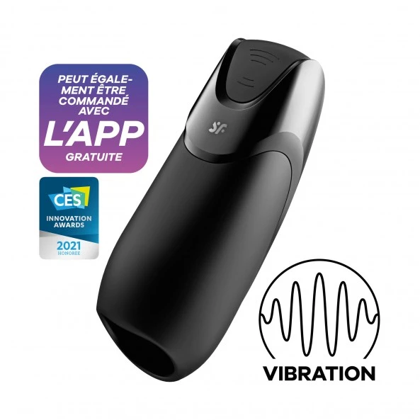 Dans le détail : Le Masturbateur Connecté Men Vibration Plus est en ABS injecté, abritant une gaine de silicone de qualité médicale hypoallergénique, sans phtalates et sans latex. Quatorze modes de stimulation différents animent ce puissant sextoy. Vous pourrez modifier et ajuster ces derniers et en découvrir bien plus via l’application gratuite Satisfyer Connect®. L’application est disponible sur l’App Store® et Google Play® et vous donne accès à toute une série de programmes et modes de fonctionnement, tous aussi délirants les uns que les autres. Cette dernière offre également à votre téléphone portable ou autre la possibilité de piloter ce sextoy sur courte distance par Bluetooth ou longue distance par Internet. L’appareil embarque une batterie Lithium-Ion de forte capacité (1200 mAh), vous donnant accès à 1H00 d’utilisation pour un temps de recharge de 5H00. La gaine silicone est démontable pour un nettoyage simple et efficace. La coque abritant le moteur est 100% waterproof. Il pourra sans problème vous suivre dans votre salle de bain ainsi que dans votre bain. Ce sextoy vous sera fourni avec un manuel d’utilisation de l’appareil, un guide rapide d’utilisation, un guide pour l’application de connectivité, un câble de chargement USB et un pochon de rangement en velours gris.
