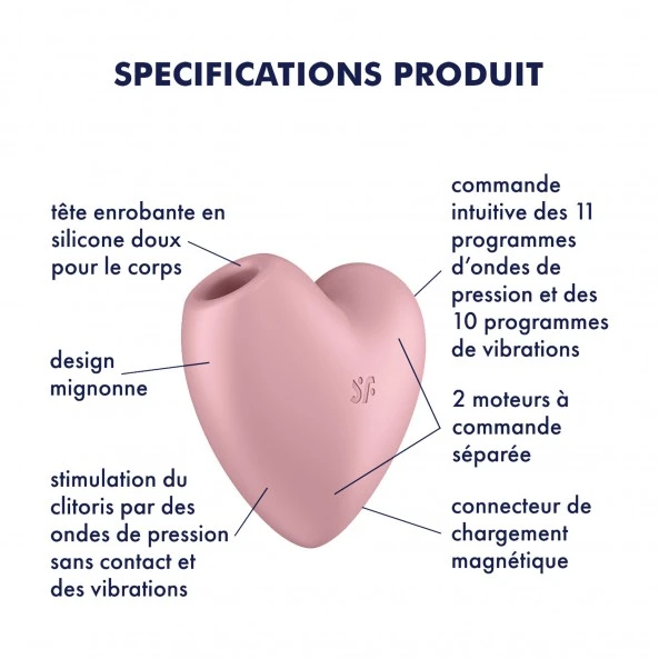 Dans le détail : Toutes les parties de ce stimulateur en contact avec le corps sont en silicone souple de très haute qualité. Il est doux, sans phtalate, sans Latex et hypoallergénique. Le pilotage de l’ensemble de ses programmes s’effectue simplement à l’aide de 3 boutons placés sur la face avant. Léger (97 Grs), ses 2 puissants moteurs indépendants sont alimentés par une batterie Lithium-Ion longue durée. Cette dernière se recharge à l’aide d’un câble USB magnétique fourni. Cutie Heart est entièrement waterproof et se fera un plaisir de vous accompagner sous la douche, et même dans votre bain.