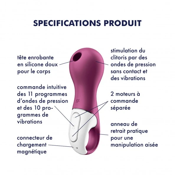 Stimulateur Clitoridien Lucky Libra…, petit, mais costaud ! Dernier-né des stimulateur par air pulsé, Lucky Libra est idéal pour un première achat de ce type de sex-toys très en vogue. Proposant pas moins de 10 programmes de vibration variées et 11 programmes d’ondes pulsées, il répondra sans problèmes à toutes vos envies. Très ergonomique et de petite taille, il s’utilise très facilement avec beaucoup de précision grâce à son large anneau présent sur le manche. Mettez l’appareil en marche, choisissez le programme qui vous convient le mieux et placez l’orifice sur votre clitoris en exerçant une légère pression. Lucky Libra s’occupe de tout pour vous faire atteindre le 7ème ciel en un temps record !