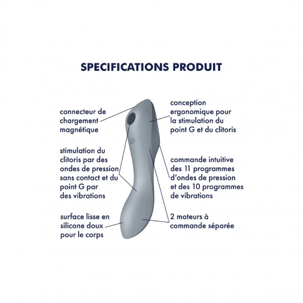 Satisfyer Curvy Trinity 3 est réalisé en ABS et silicone de qualité hypoallergénique. Waterproof (IPX7), il vous suivra sous la douche ou dans votre bain. Il dispose de 2 moteurs indépendants, 12 modes de vibration, 11 programmes de stimulation sans contact et se recharge par USB grâce au cordon magnétique inclus.
