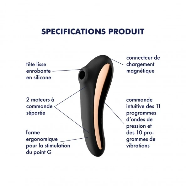Satisfyer Dual Kiss est réalisé en ABS et silicone de qualité hypoallergénique. Waterproof (IPX7), il vous suivra sous la douche ou dans votre bain. Il dispose de 2 moteurs indépendants, 10 modes de vibration, 11 programmes de stimulation sans contact et se recharge par USB grâce au cordon magnétique inclus.