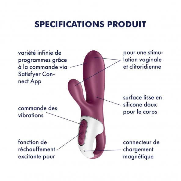Le Vibromasseur Rabbit Chauffant Connecté Hot Bunny est comme son nom l’indique, chauffant, mais il peut vibrer avec une infinité de modes différents. Court et épais, il cible avec une très grande efficacité votre Point-G, l’ensemble du vagin, mais aussi votre clitoris. Pour cela, il embarque 2 puissants moteurs indépendants qui comportent 12 modes de vibration installés en usine. Ces derniers sont modifiables via l’application gratuite Satisfyer Connect®. L’application est disponible sur l’App Store® et Google Play® et vous donne accès à toute une série de programmes et modes de fonctionnement tous aussi délirant les uns que les autres… Cette dernière offre également à votre portable ou autre la possibilité de piloter ce sex-toy sur courte distance par Bluetooth ou longue distance par Internet. Pour joindre le confort à l’efficacité, la marque y a ajouté un mode chauffant qui rend immédiatement le Hot Bunny extrêmement agréable à utiliser. Il est entièrement recouvert de silicone hypoallergénique de très haute qualité. Enfin, Hot Bunny est équipé d’une batterie interne lithium-ion rechargeable par câble USB magnétique fourni avec l’appareil et il pourra sans problème vous suivre dans votre baignoire ou sous votre douche, car il est complètement waterproof (IPX7). À acquérir pour découvrir de toutes nouvelles sensations !