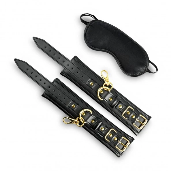 Cet ensemble Special Edition très haut de gamme comprend une paire de menottes en simili-cuir végan, mais aussi un masque occultant. Les menottes sont pourvues de mousquetons rotatifs à ouvertures faciles en acier doré garanti sans Nickel. Elles pourront facilement se connecter à tous les accessoires de la marque Sportsheets. Le petit plus de ce kit, est son masque occultant en satin noir qui remplit parfaitement son rôle et vient parfaire avec brio un ensemble d’exception.