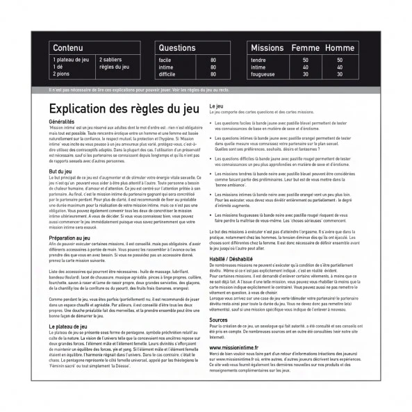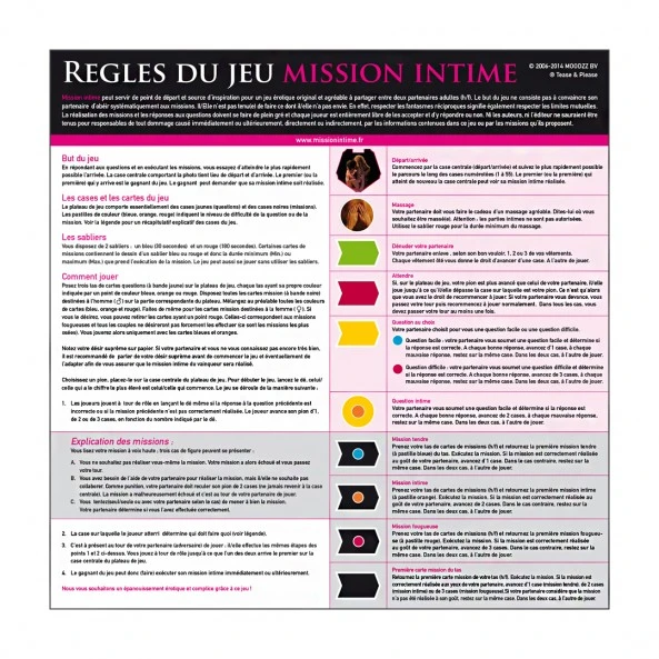 Mission Intime est un jeu coquin, pour couples, original et qui peut se transformer en soirée fous-rires, ou soirée… Le principe sera d’arriver premier afin que votre désir / vœu intime du soir soit réalisé. Mais le parcours est parsemé de questions, et de gages à réaliser en temps limité. De quoi découvrir l’autre, s’instruire, et faire monter le désir… « Votre mission, si vous l’acceptez » sera de vous contenir pour parvenir à finir la partie ! Trois niveaux de jeu pour des gages de plus en plus osés. Prévoyez champagne, chantilly, huile de massage… Vous ne savez pas ce que vous réservent les cartes … Et laissez monter la température !