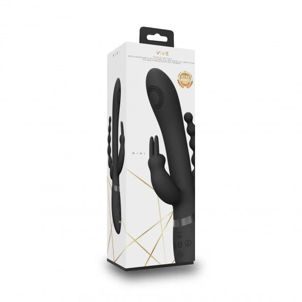 Dans le détail : D’une technologie innovante, il est pourvu de 3 moteurs indépendants possédant 10 modes de vibration différents, tous discrets + une fonction « Climax » pour un pic de puissance maximum pour des orgasmes intenses. Vous pourrez le contrôler grâce à ses boutons placés sur la face interne du sextoy. Le vibromasseur Rabbit & Anal RINI de VIVE est pourvu d’un design exceptionnel tout comme les matériaux utilisés : Revêtement en silicone de qualité médicale et dépourvu de phtalate. Il pourra être utilisé sous et dans l’eau, car il est 100% waterproof. Les dimensions insérables de la hampe sont de 3,4 cm de diamètre et d’une longueur de 15,5 centimètres. Celles de la mini-chaîne anale sont de 2 cm de diamètre et d’une longueur de 9,5 centimètres. Le silicone ultra souple et flexible apporte une adaptation des plus confortables selon la zone stimulée. Autonomie : Environ 60 minutes à pleine puissance. Chargement en 3H00 environ par prise USB (cordon inclus). Pressez le bouton central pendant 3 secondes pour allumer ou éteindre le stimulateur.