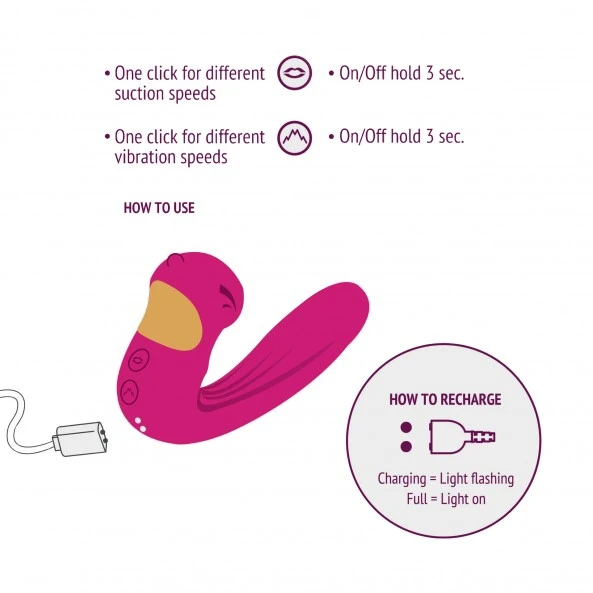 Dans le détail et en résumé : Toutes les parties en contact avec le corps sont recouvertes de silicone sans phtalates ni latex, de très haute qualité. Il résiste aux fortes projections d’eau grâce à son respect des normes IPX6, vous pouvez de ce fait l’utiliser sans problème sous la douche. Il mesure 15 cm de long pour une largeur de 8,5 cm en totalité, avec 14 cm de longueur insérable et un diamètre de 3 cm pour la partie vaginale. Le diamètre de l’orifice clitoridien est de 1,3 cm. Il est doté de 2 puissants moteurs silencieux totalement indépendants, animés par 10 modes de vibration pour la partie du Point-G et 5 modes de vibration pour la partie clitoris. Il se recharge via un câble USB magnétique fourni, à brancher de préférence sur un chargeur téléphonique de type iPhone, Samsung, etc.